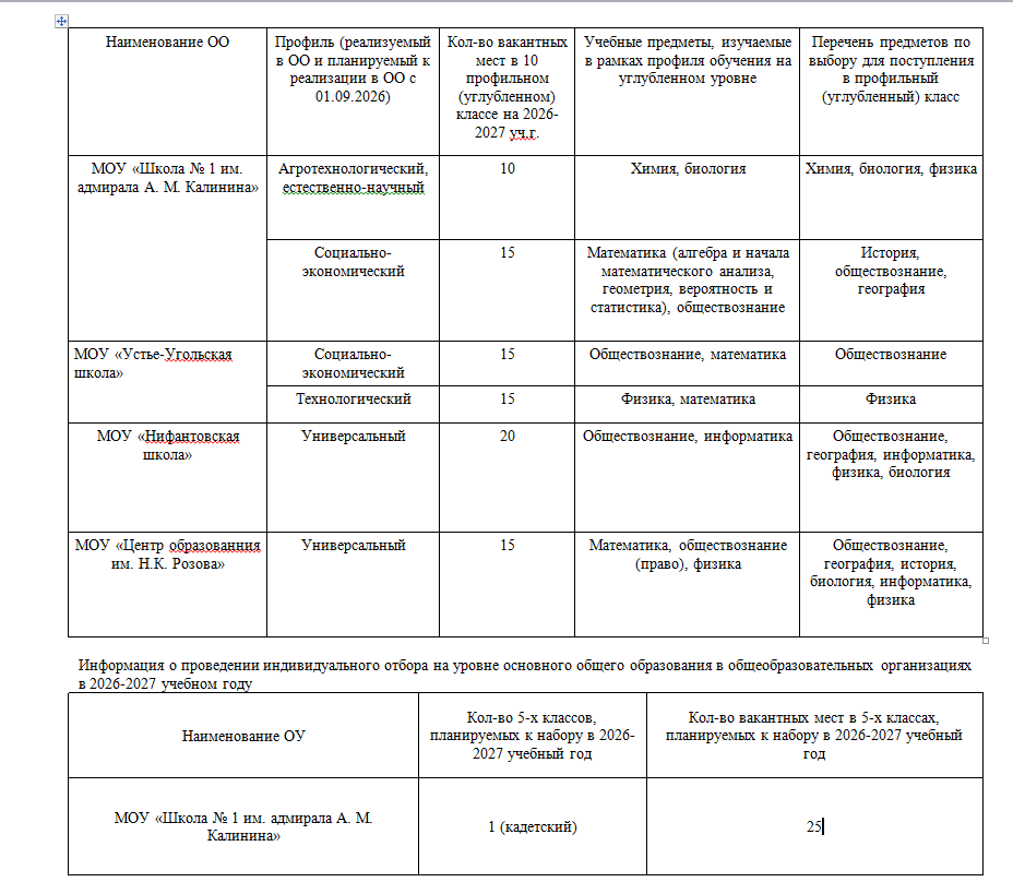 Прием в 5, 10 классы на 2026-2027 учебный годУправление образования администрации Шекснинского муниципального района информирует о планируемых к открытию в 2026-2027 учебном году 10 классах: о количестве классов, реализуемых профилях, направленности и учебных предметах, необходимых для индивидуального отбора в конкретной организации. Организация приема в 10 (десятые) классы общеобразовательных учреждений осуществляется в соответствии с Федеральным законом от 29.12.2012 № 273-ФЗ «Об образовании в Российской Федерации»; Приказом Минпросвещения Росси от 02 сентября 2020 г. № 458 «Об утверждении Порядка приема на обучение по образовательным программам начального общего, основного общего и среднего общего образования »; Постановлением Правительства Вологодской области от 24 февраля 2014 г. N 122 «Об утверждении Порядка организации индивидуального отбора обучающихся при приеме либо переводе в государственные и муниципальные образовательные организации области для получения основного общего и среднего общего образования с углубленным изучением отдельных учебных предметов или для профильного обучения» (с изменениями). Каждая школа разрабатывает свои локальные нормативные акты, регламентирующие процедуру индивидуального отбора обучающихся в профильные 10-е классы в части, не урегулированной законодательством. В общеобразовательных организациях Шекснинского муниципального района в 2026-2027 учебном году планируется открыть следующие профили (представлены в приложении)