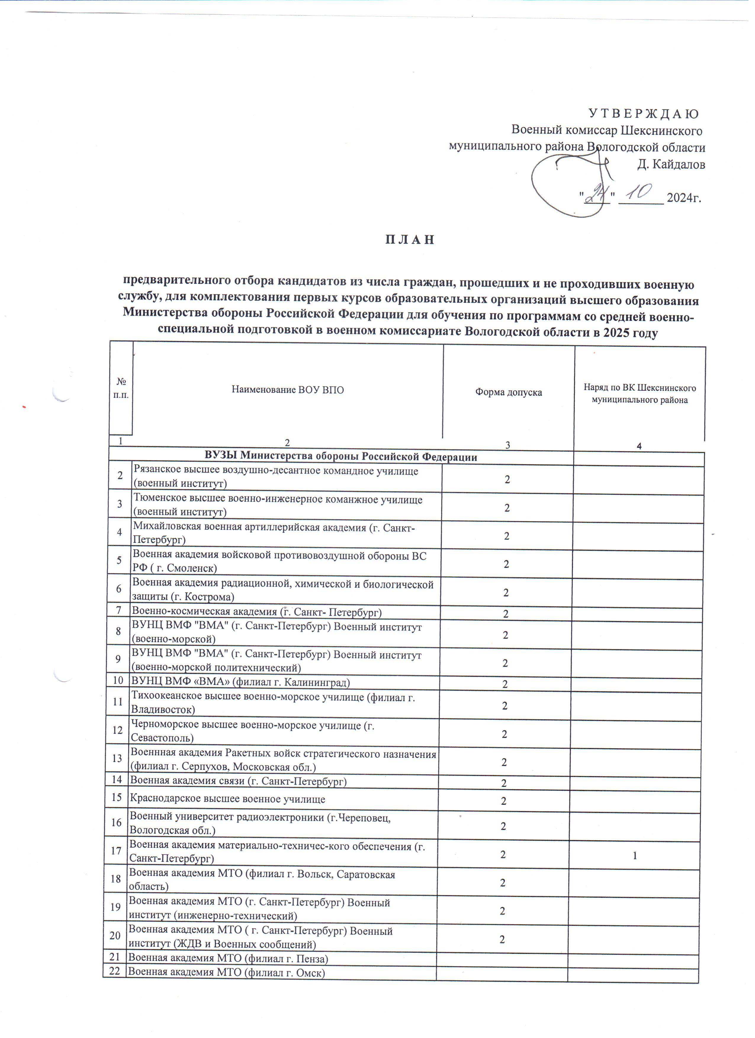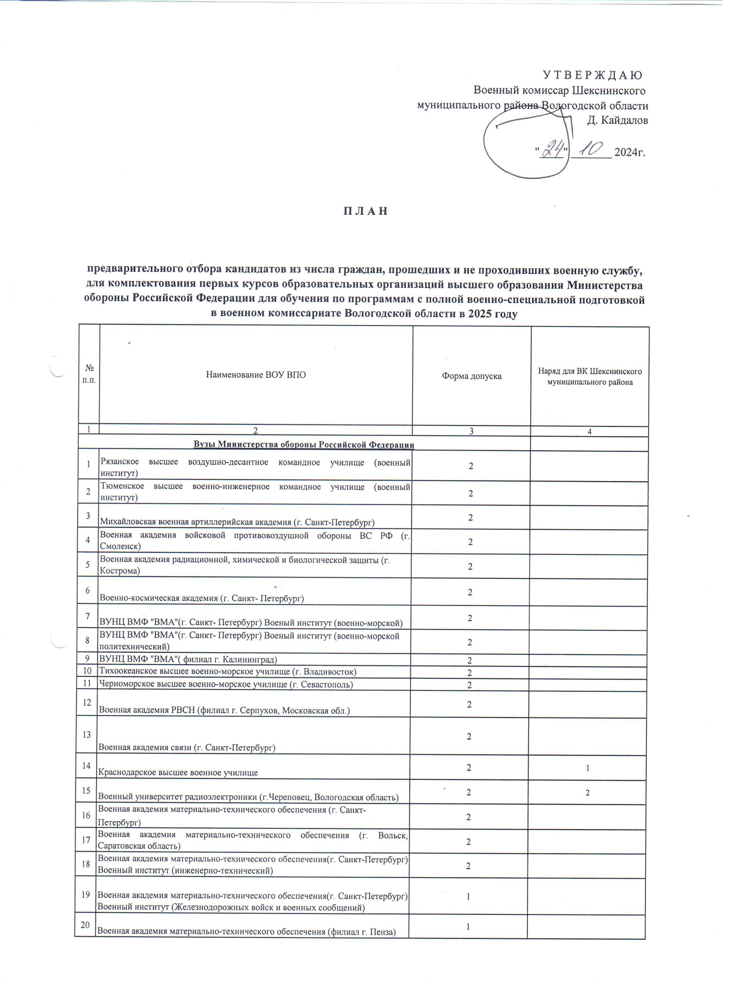 План предварительного отбора кандидатов из числа граждан, прошедших и не проходивших военную службу, для комплектования образовательных учреждений высшего профессионального образования Министерства обороны Российской Федерации и федеральных органов исполнительной власти Российской Федерации для бучения с полной и средней военно-специальной подготовкой в военном комиссариате Вологодской области в 2025 году